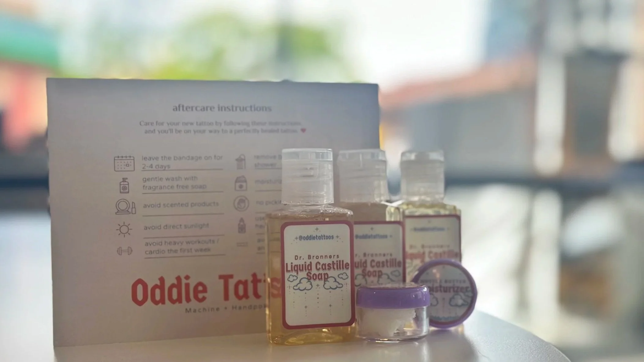 Most drug stores will carry soaps and moisturizers that are fine for tattoo healing. Make sure to pick one up before your appointment so you don’t have to stress about it afterwords. (I try and prepare sample soaps and moisturizers for my clients who are getting their first tattoo, but there are times i run out of stock so prepping before hand is always a proactive choice.) You are pretty much looking for anything that is unscented. You may have heard of just your basic dove bar soap, but I personally prefer the Dr. Bronners unscented Liquid Castille liquid soap as it’s easy to use, lasts a while and is perfect for cleansing your brand new tattoo. If you choose to use a bar soap, just make sure it is a brand new bar before using it on your freshly unwrapped tattoo.